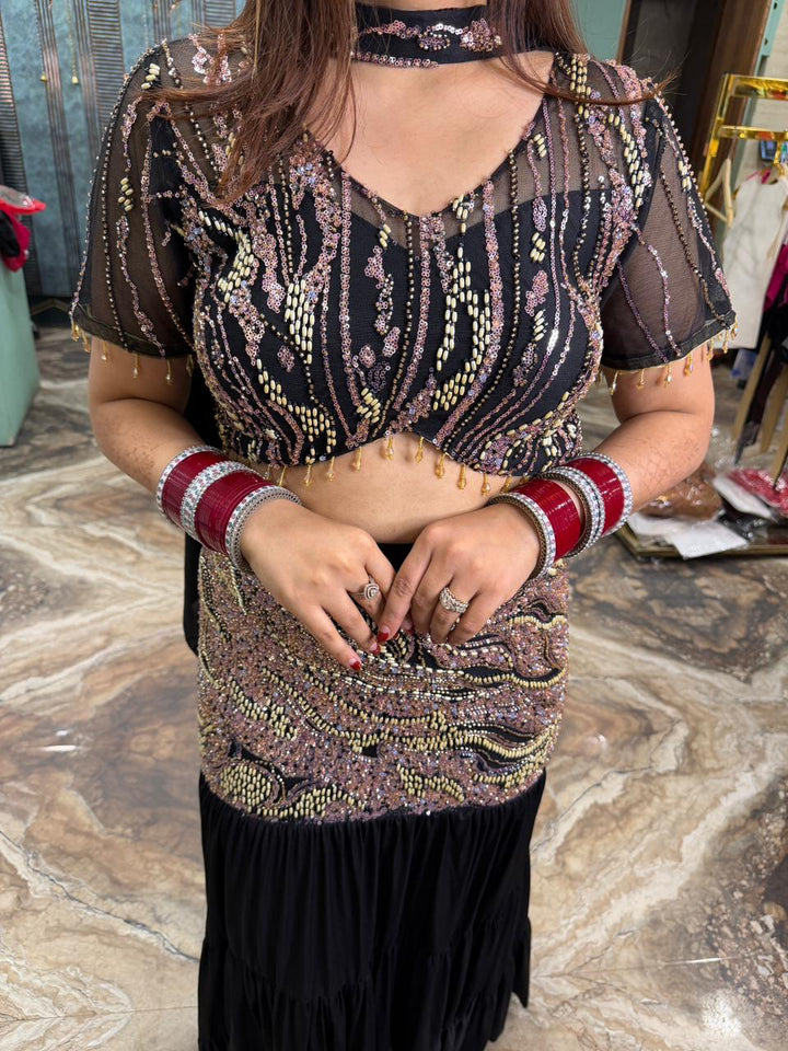 The outfit appears to be an Indo-Western style blouse skirt set. The top is a black, short-sleeved, cropped blouse intricate bead and sequin work in black, gold, and bronze tones. The pattern on the top resembles a zigzag or abstract linear design.