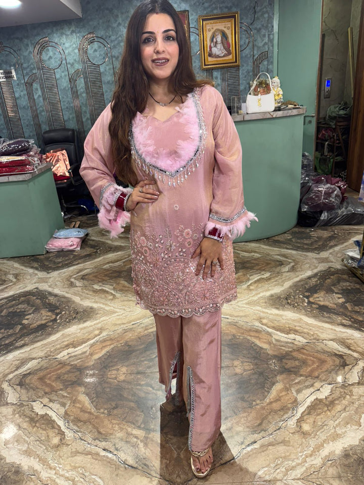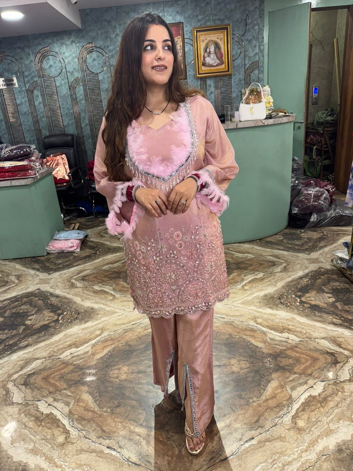 Pant Highlights: Coordinating blush pants with front slit detailing enhanced with shimmering silver borders.