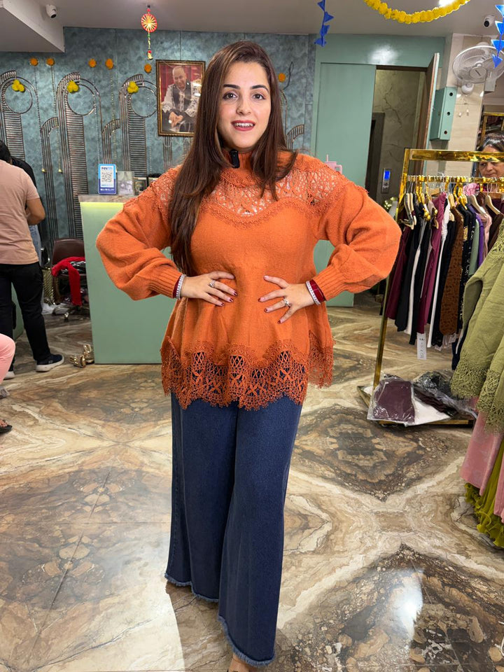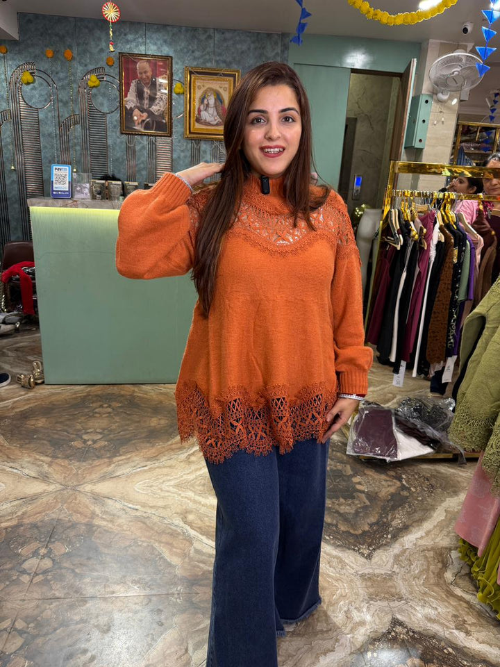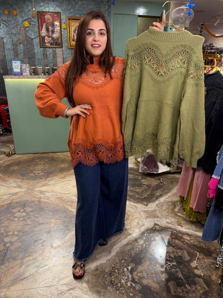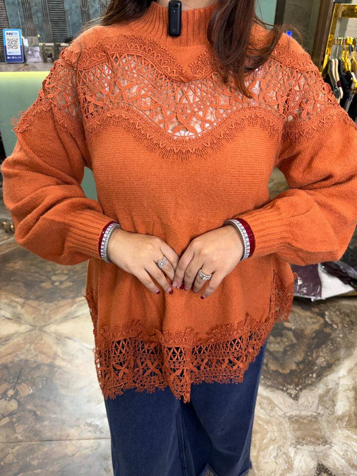 The sweater features a high mock neck and long, full sleeves with ribbed cuffs. It has intricate lace or crochet patterns on the yoke and the bottom hem, providing a contrasting texture to the ribbed knit body.