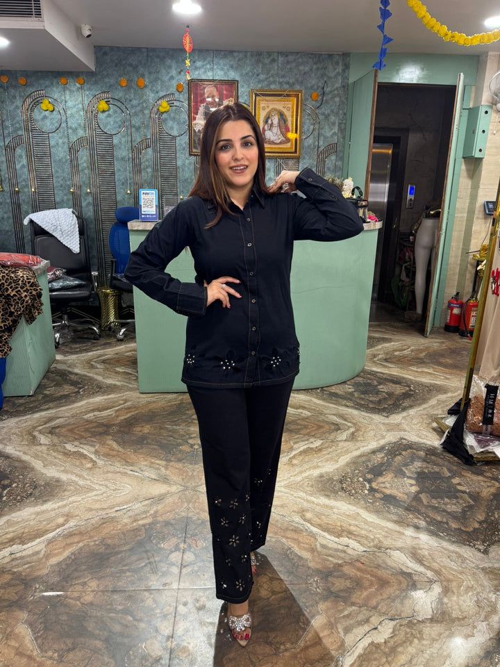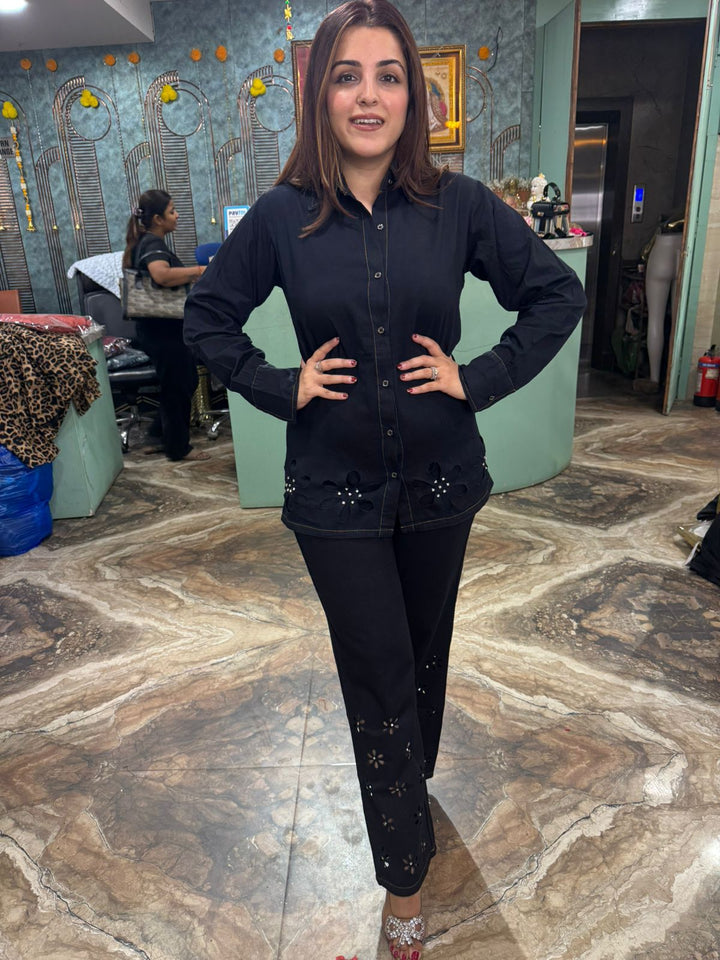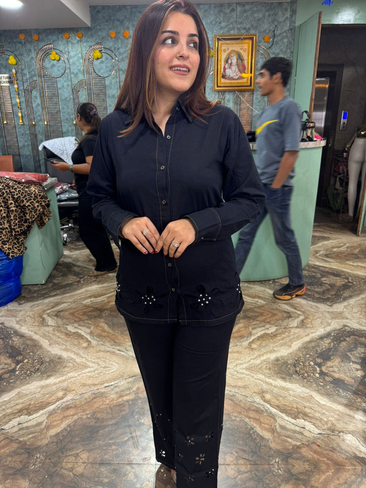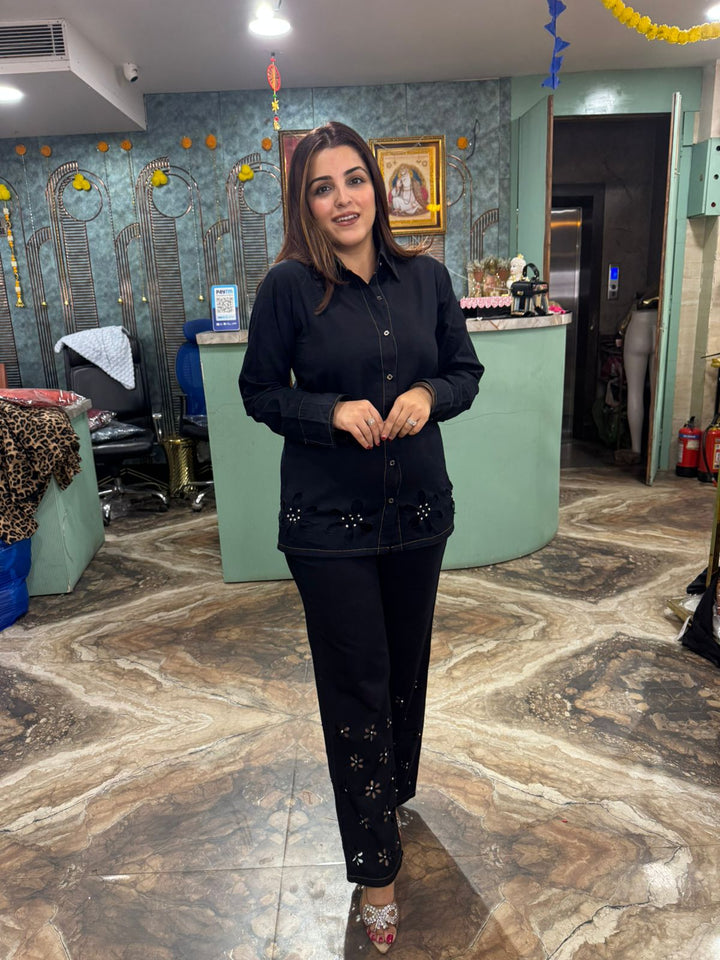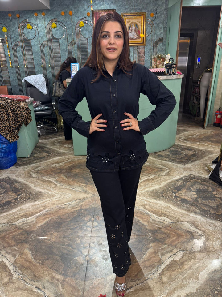 This two-piece outfit is a black co-ord set, which includes a collared shirt and matching trousers. The pieces feature laser-cut floral patterns with beaded or sequin embellishments on the lower part of the shirt and along the bottom of the trousers. The set is made from denim, providing a stylish and comfortable fit.