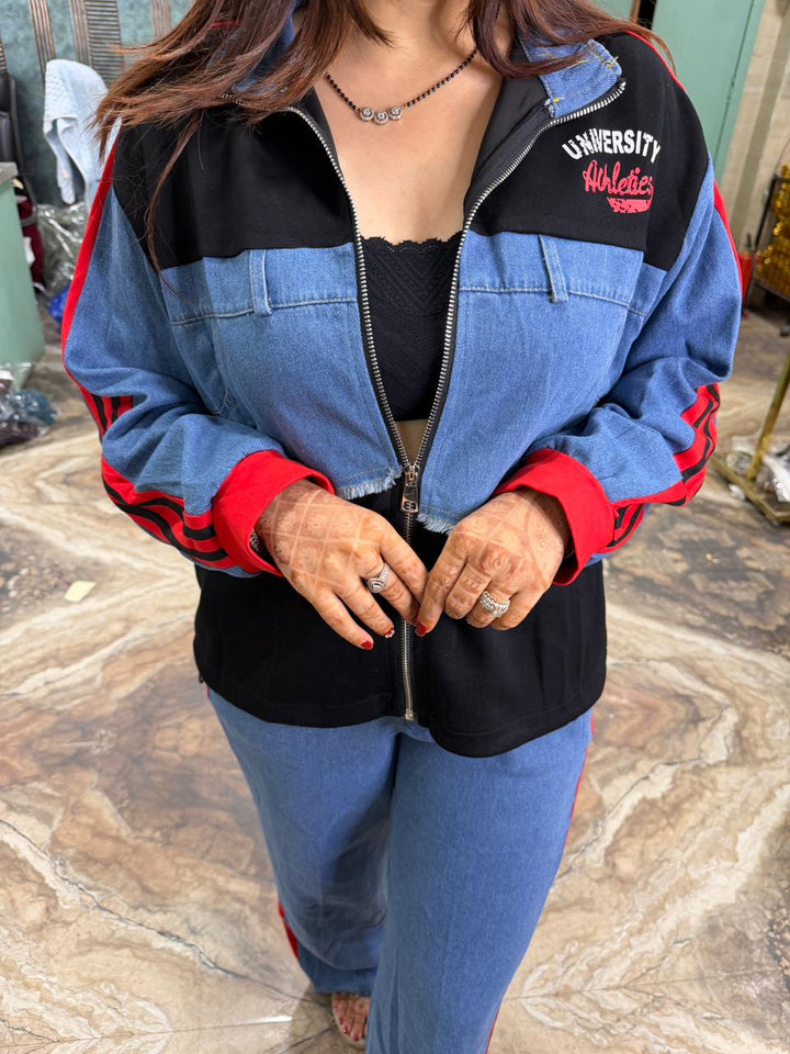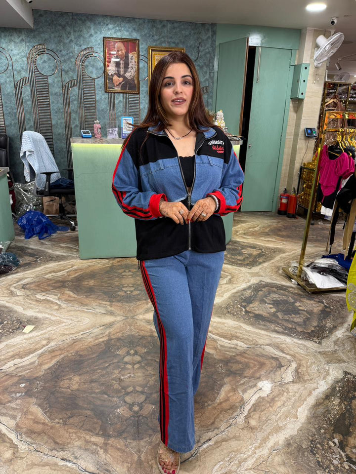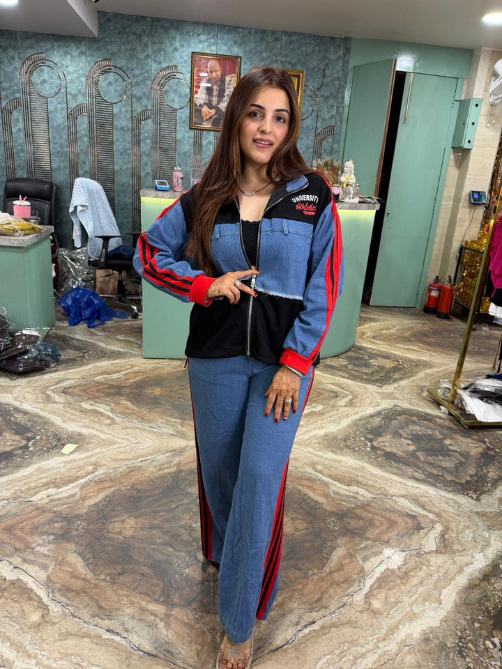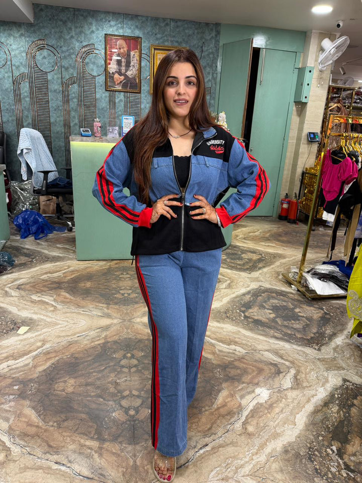 Based on the product is a two-piece denim tracksuit. The set consists of a blue denim jacket with a black yoke and red stripes on the sleeves, and matching blue denim pants with red stripes down the sides.