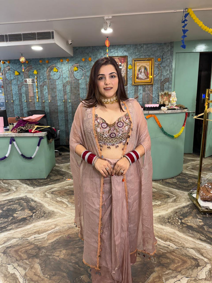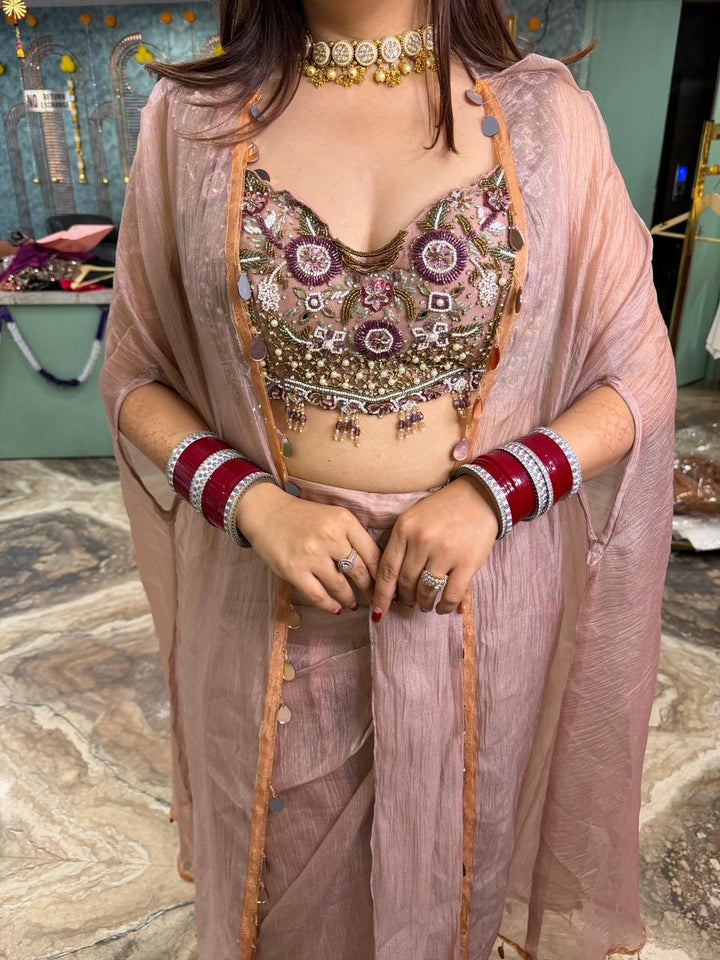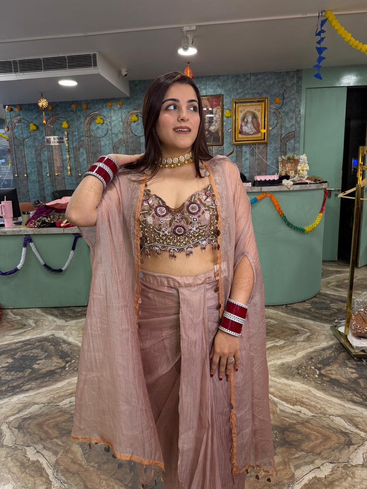 The ensemble features a pink, sleeveless, embellished crop top with a sweetheart neckline, paired with matching stylish skirt . A long, sheer, and flowing shrug is worn over the top, which can have intricate embroidery or beadwork. This type of outfit is popular for weddings, festive occasions, and parties.