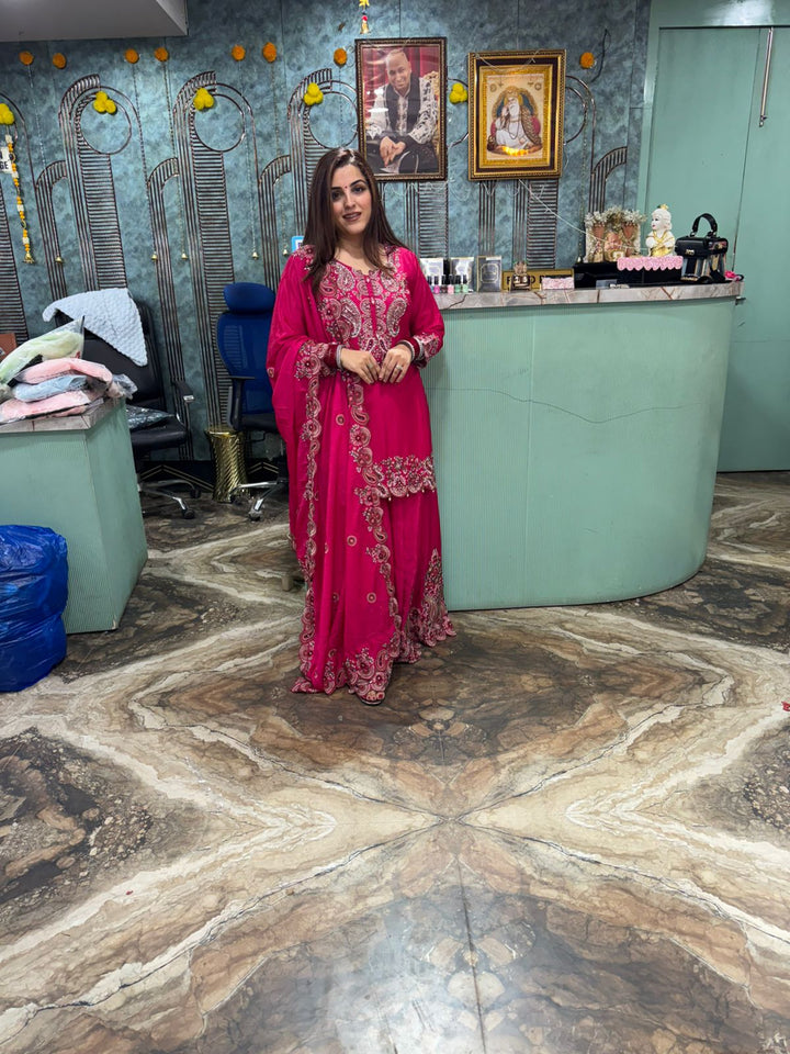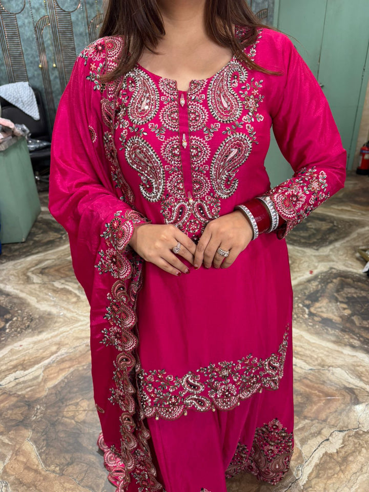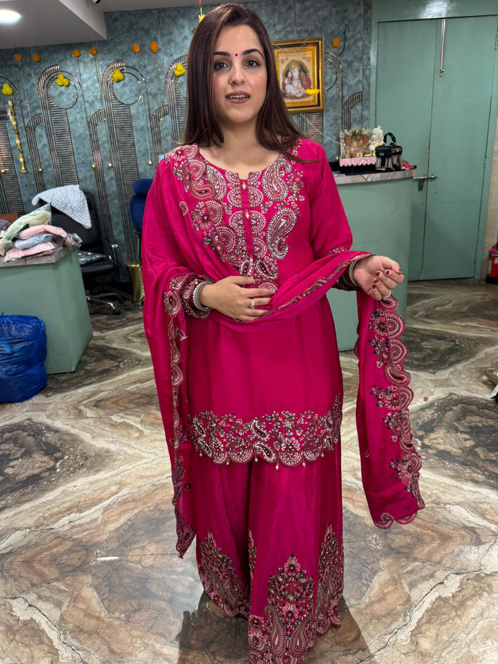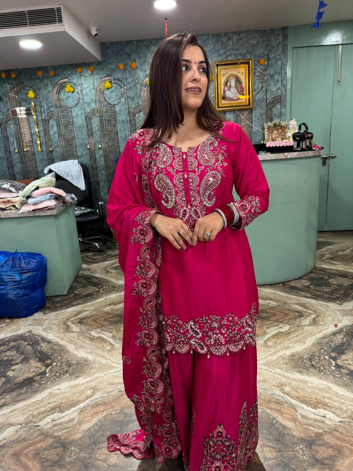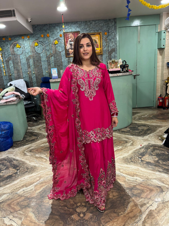 The suit is a vibrant fuchsia or hot pink color, featuring intricate embroidery with sequin work. It includes a long suit, wide-legged pants (sharara or palazzo), and a matching dupatta with a detailed border. The fabric is described as Chinnon. The style is suitable for festive occasions, such as parties or sangeets.