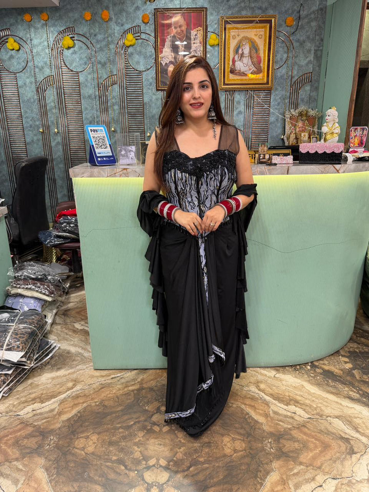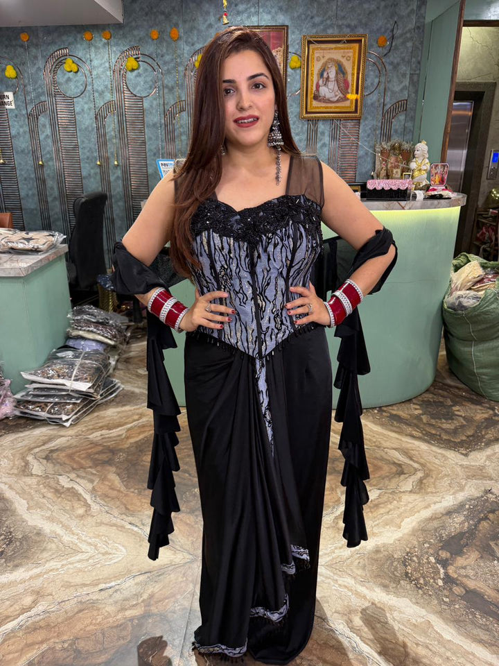 The outfit shown in the image is a black and grey corset saree or an Indo-Western draped saree set. It features a corset-style bodice with grey detailing and a sweetheart neckline, paired with a black pre-draped skirt-saree. The ensemble is sometimes described as a saree gown or a draped saree with a corset blouse. The look is completed with black ruffled duppata.
