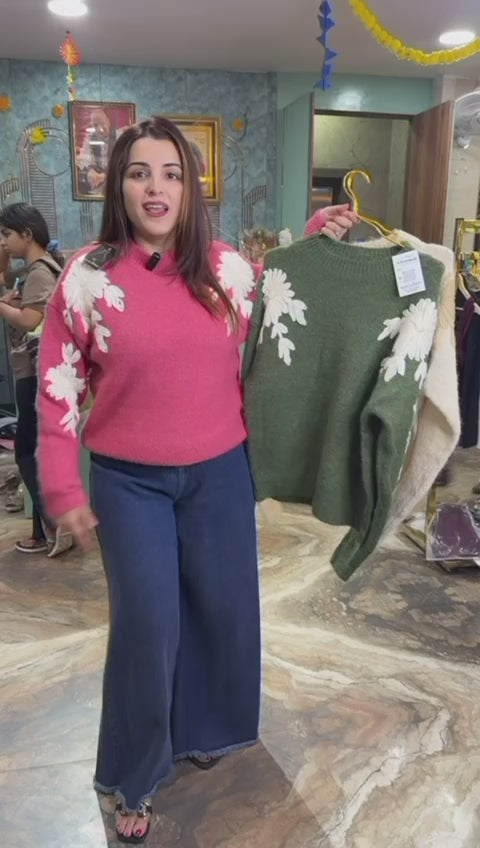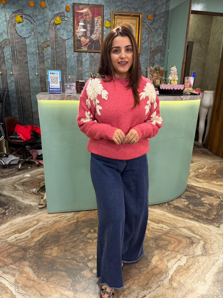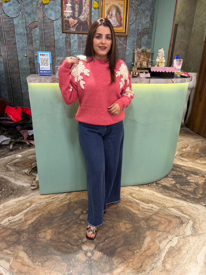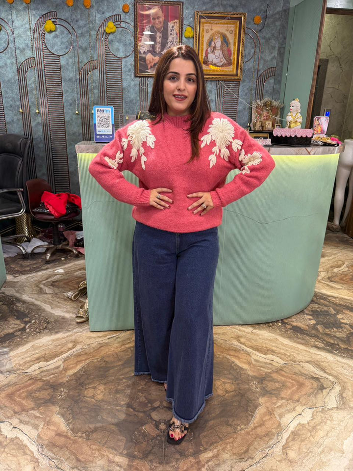 The product is an Embroidered Floral Knit Sweater.A pink marl knit sweater with a round neck and long sleeves. It features embroidered floral detailing in a light color, likely white or off-white, on the front shoulders and sleeves.