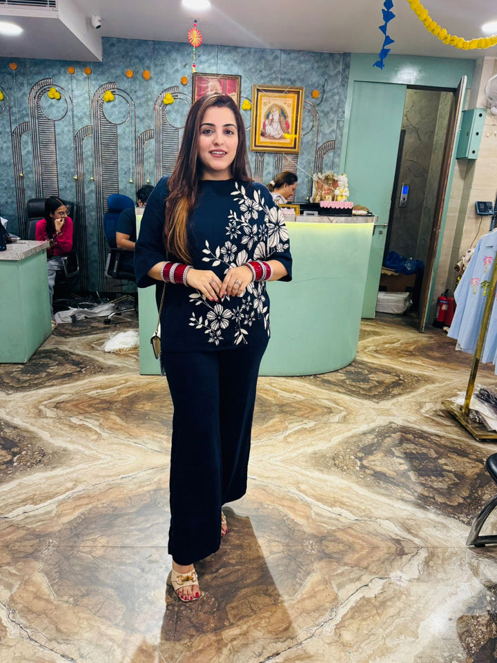 The outfit a co-ord set, this is a matching two-piece outfit consisting of a top and bottom. The top is a nevy blue, short-sleeved sweater with a white floral pattern. The pants are also nevy blue and appear to be part of the matching set. including knit sweaters with wide-leg pants.
