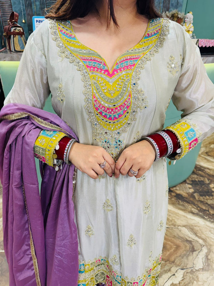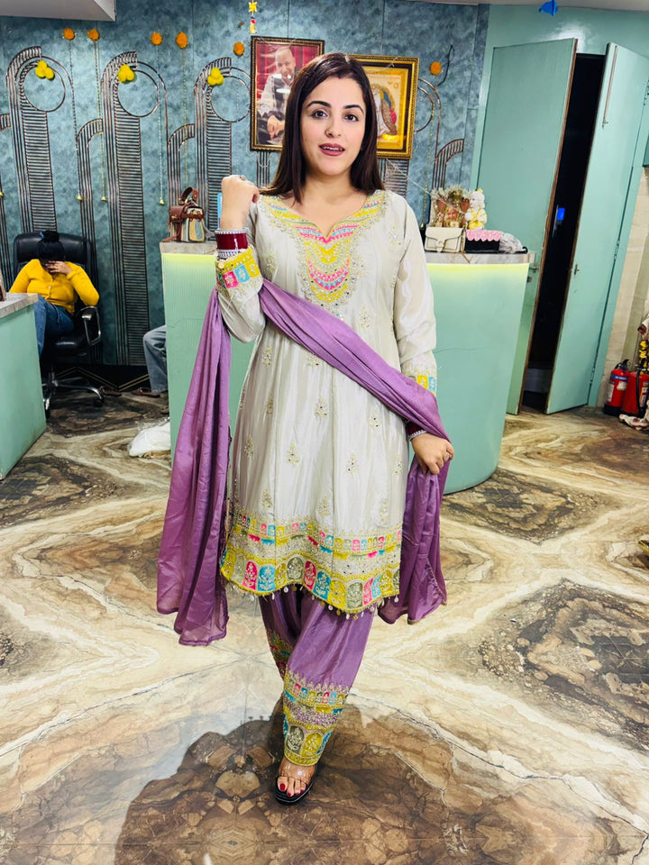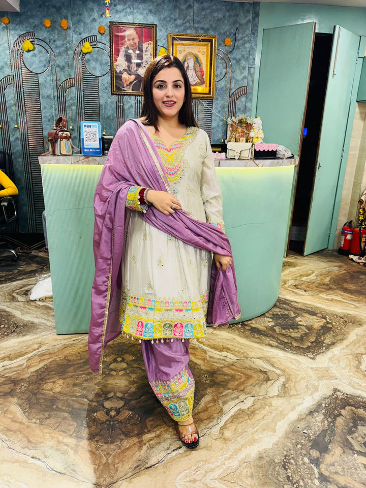 The outfit is a traditional Indian designer suit, specifically a type of salwar frock style suit with a patiala-style bottom. The suit features a light-colored, long tunic suit with detailed multicolored embroidery and embellishments, including mirror work, around the neckline and hem. The pants (salwar) are a vibrant purple with matching embroidery and mirror work at the bottom. The ensemble is completed with a purple dupatta , which is draped over the shoulders.