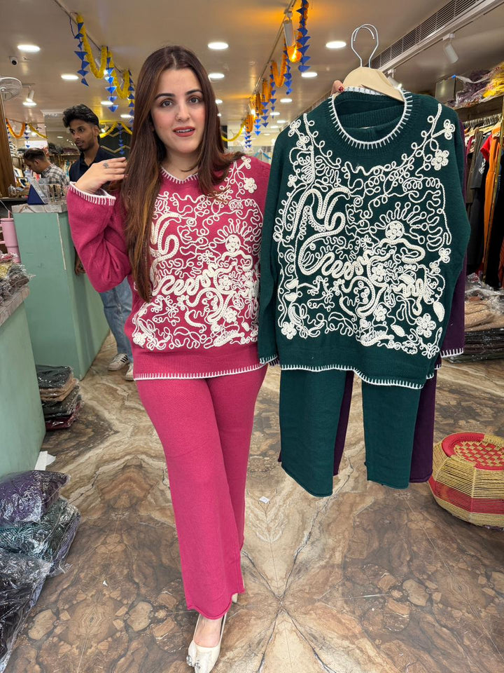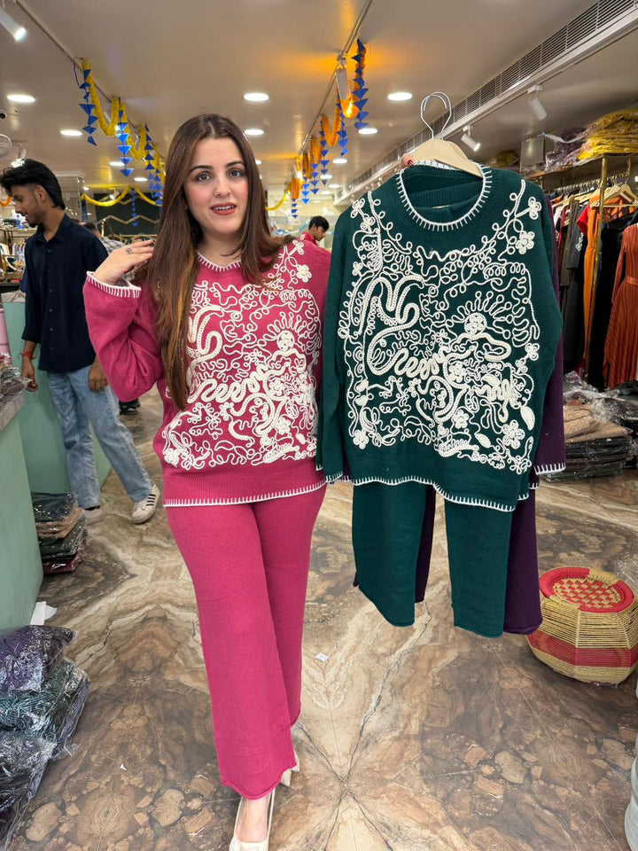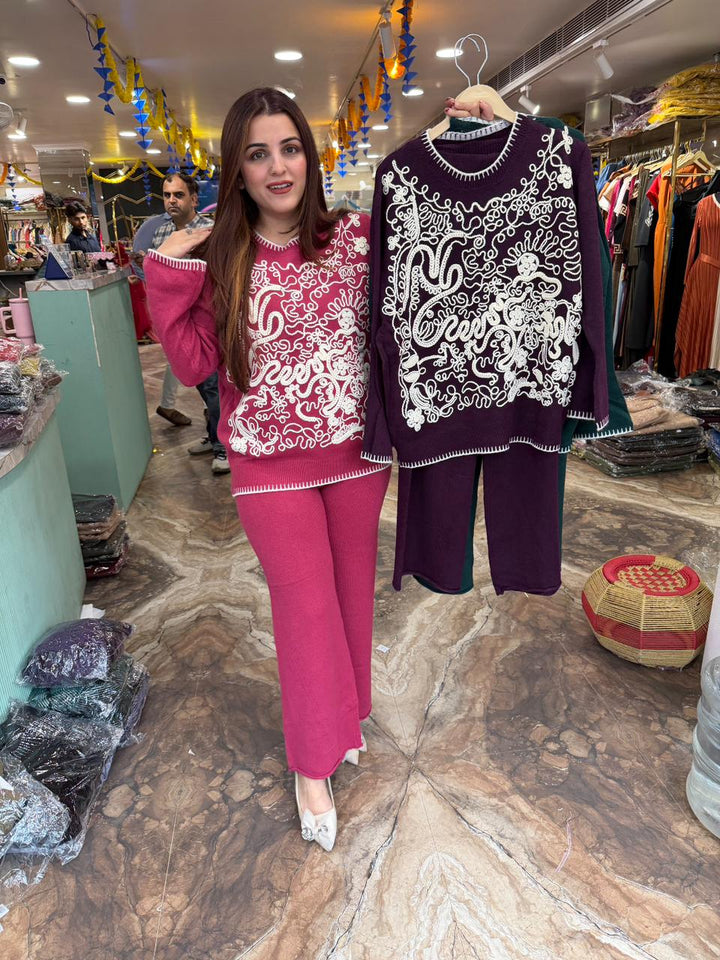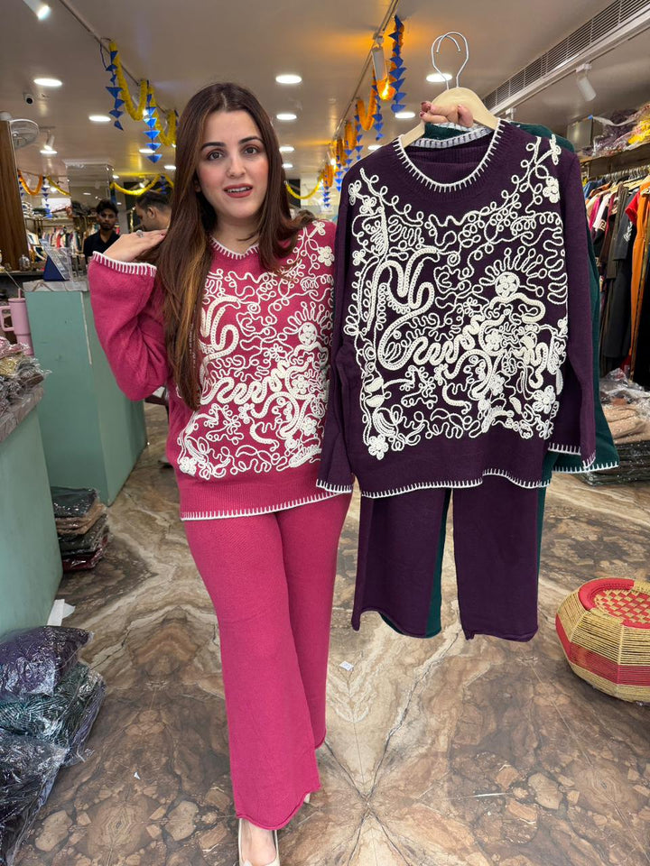 The product is a pink two-piece knitted co-ord set with a white embroidered floral and abstract pattern. It consists of a round-neck sweater with long sleeves and matching wide-leg trousers. Based on visual and product-based searches