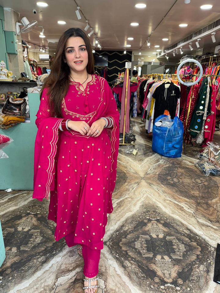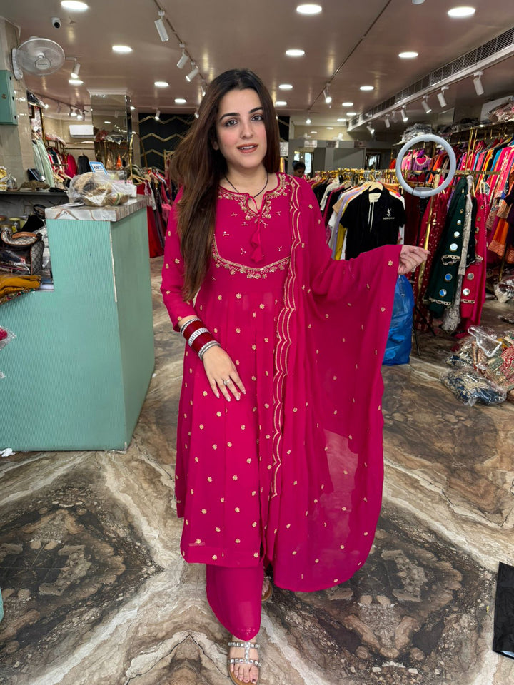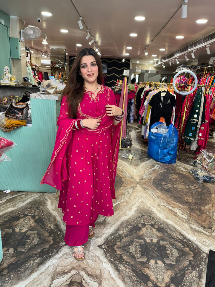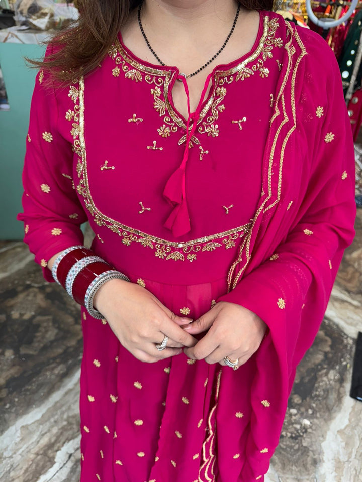 This maroon Anarkali-style suit set, delicately crafted in soft georgette fabric. The outfit features a flared Anarkali kurta adorned with golden thread and sequin embroidery on the neckline, sleeves, and yoke, adding a regal touch. Small scattered golden butis throughout the kurta and dupatta enhance its festive appeal.