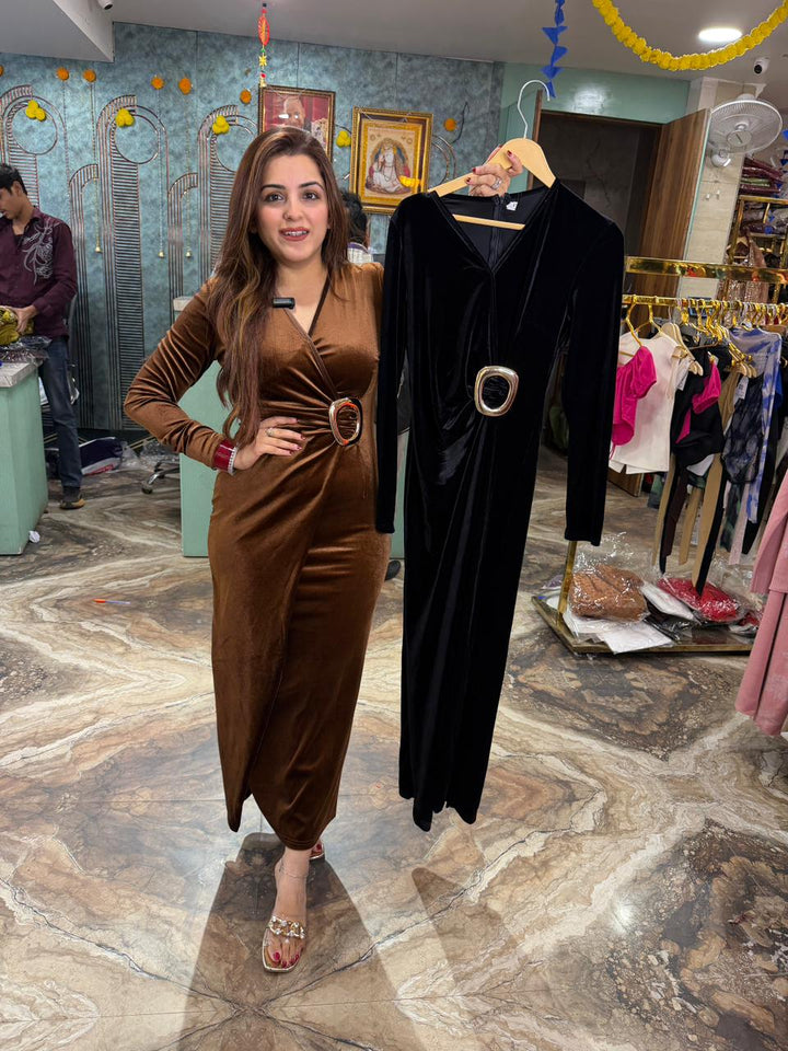 A brown velvet long-sleeve wrap dress with a buckle . The dress is made of crushed velvet fabric with a twist detail at the waist, a V-neckline,t is a bodycon style that skims the curves. This style of dress is often described as being elegant and suitable for various special occasions like holiday gatherings, weddings, and parties. The wrap design and ruched velvet material are often considered to be flattering and comfortable.