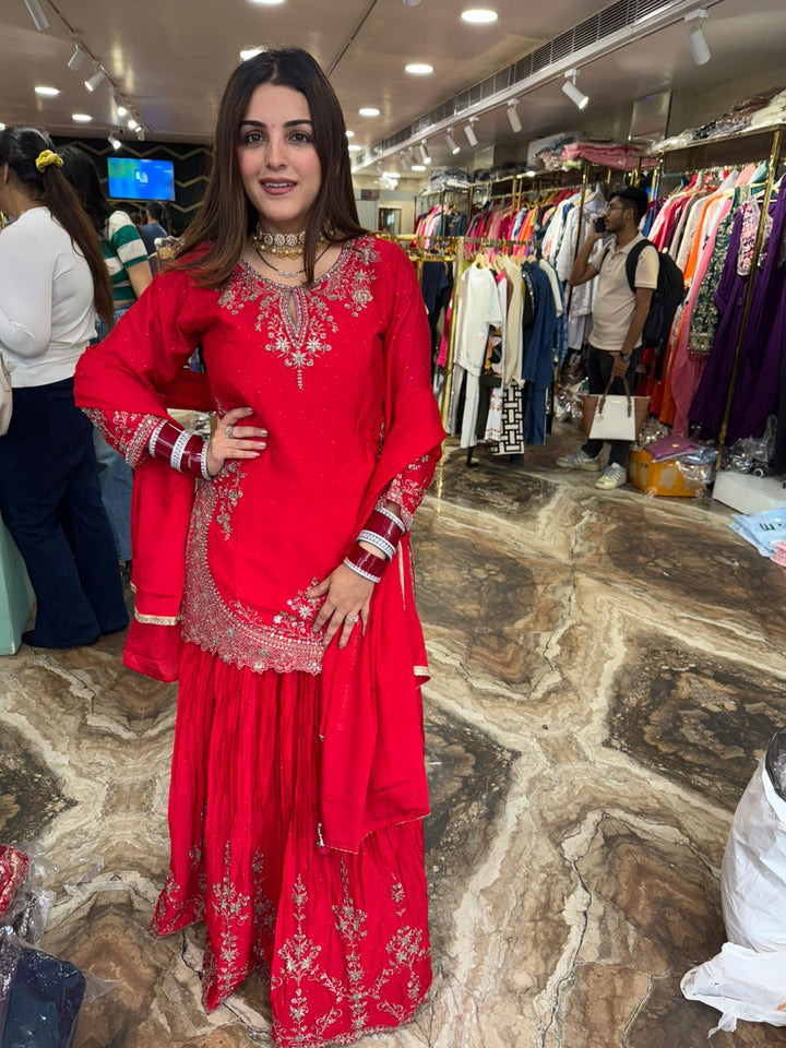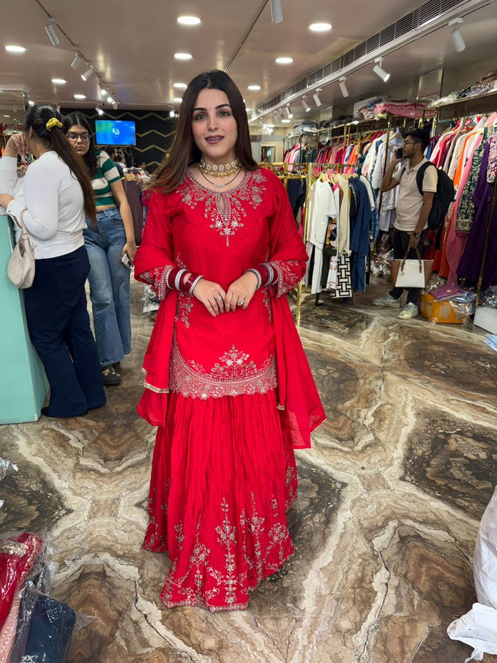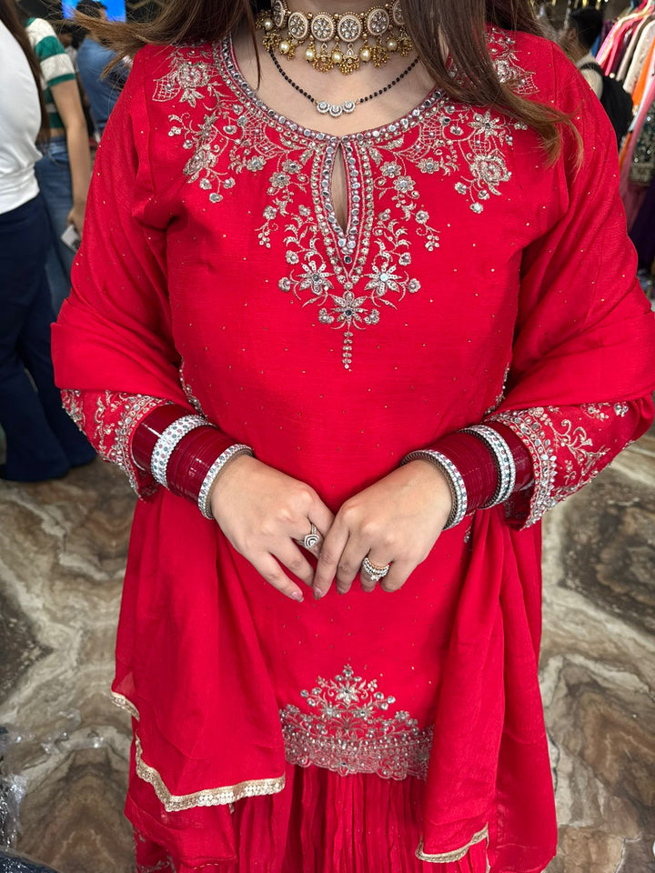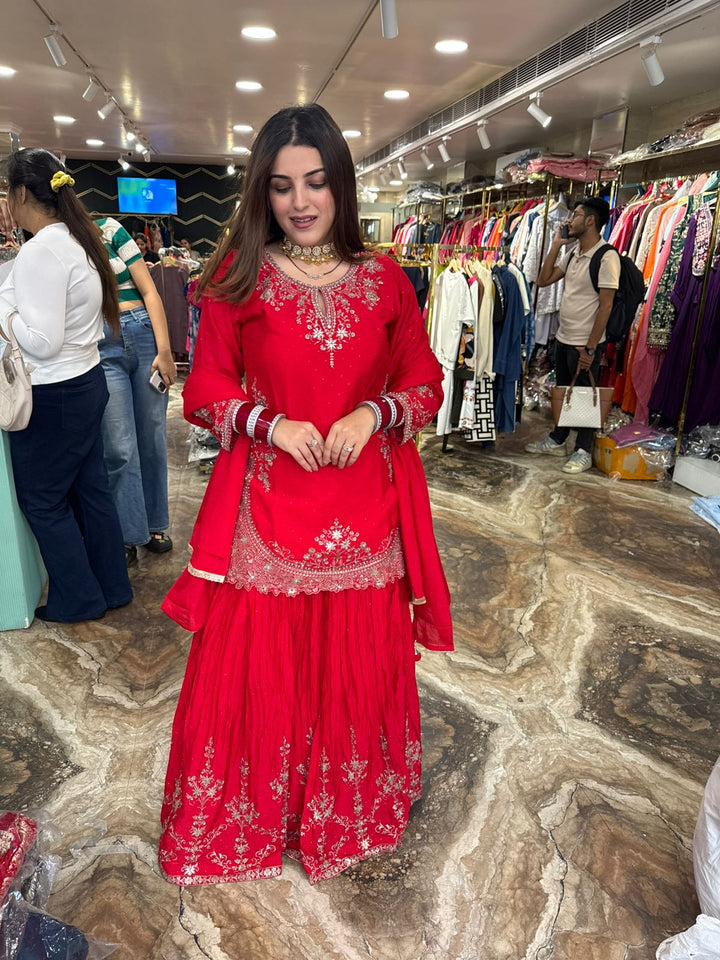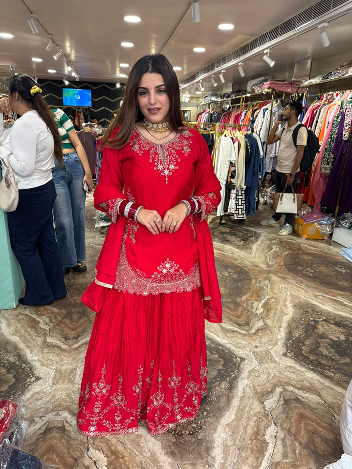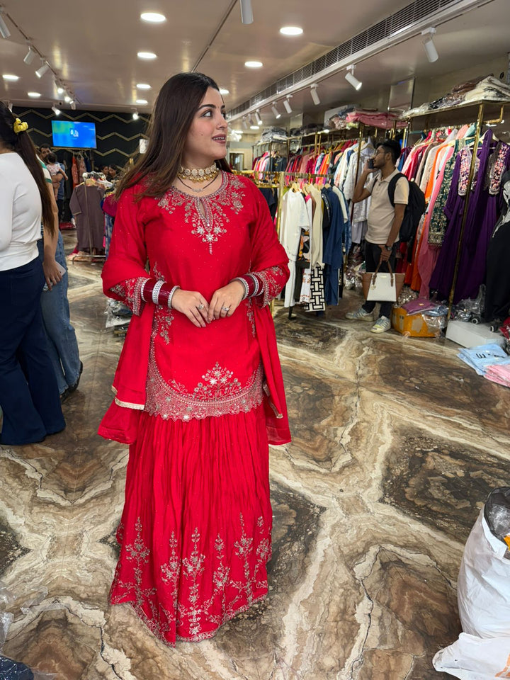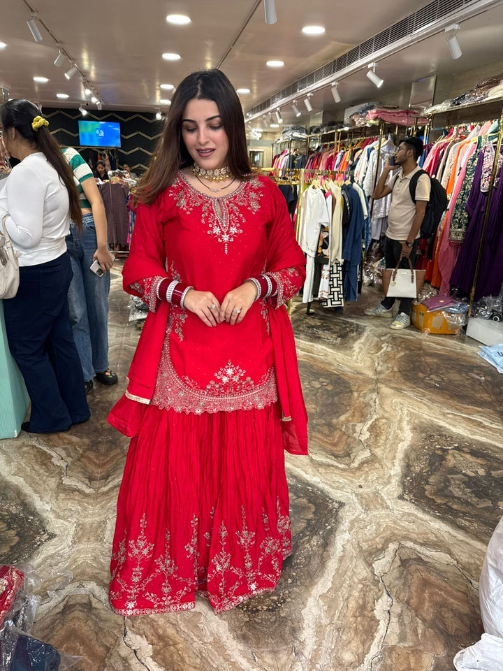 This stunning three-piece red skirt set. The ensemble features a long straight kurti with a delicate keyhole neckline, richly adorned with silver zari, sequins, and thread embroidery across the neckline, hemline, and sleeves. Tiny shimmering sequins are scattered throughout, adding a touch of sparkle.