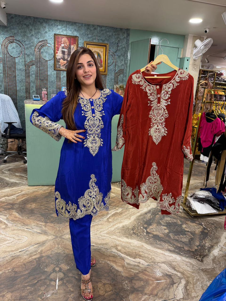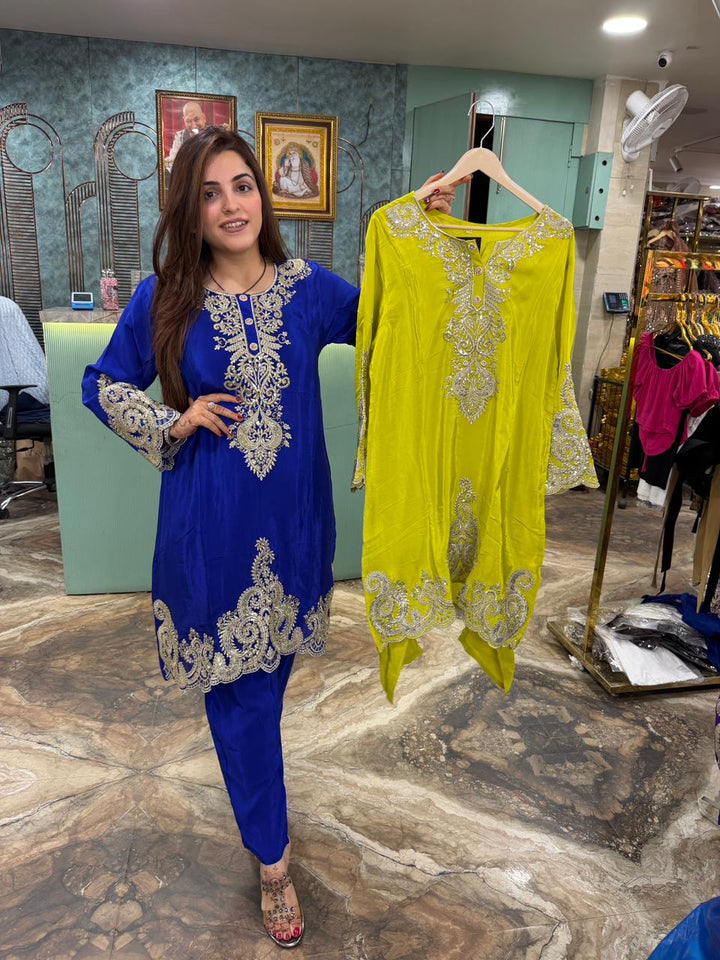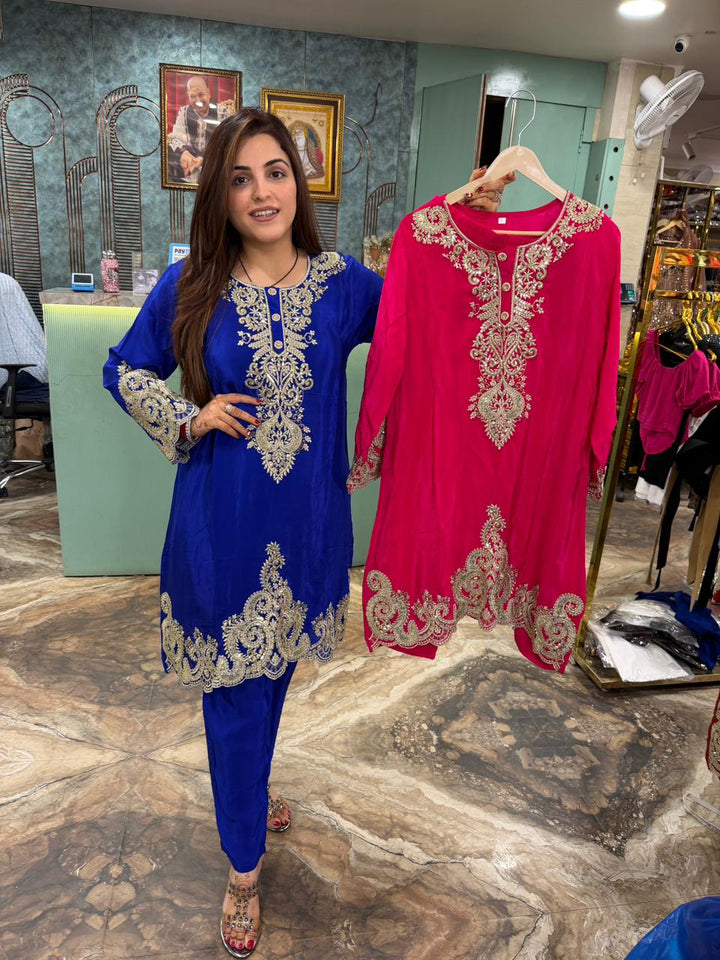 This stunning Royal Azure Embroidered Kurta Set. Crafted in a rich royal blue silk fabric, the outfit features intricate golden zari and sequin embroidery along the neckline, sleeves, and hemline, giving it a regal festive touch. The kurta has a straight cut silhouette with a round neckline and decorative pearl-style buttons, paired with matching slim-fit trousers for a graceful look.