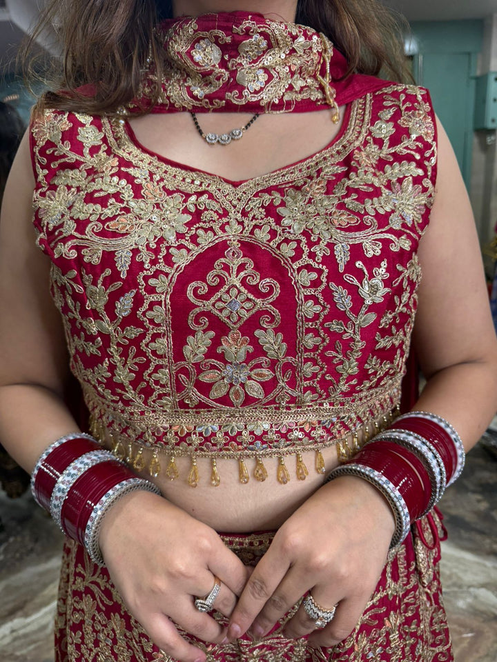 Highlighted with stone-studded detailing, rich craftsmanship, and classic red glass bangles, this ensemble brings together royal artistry and contemporary elegance.