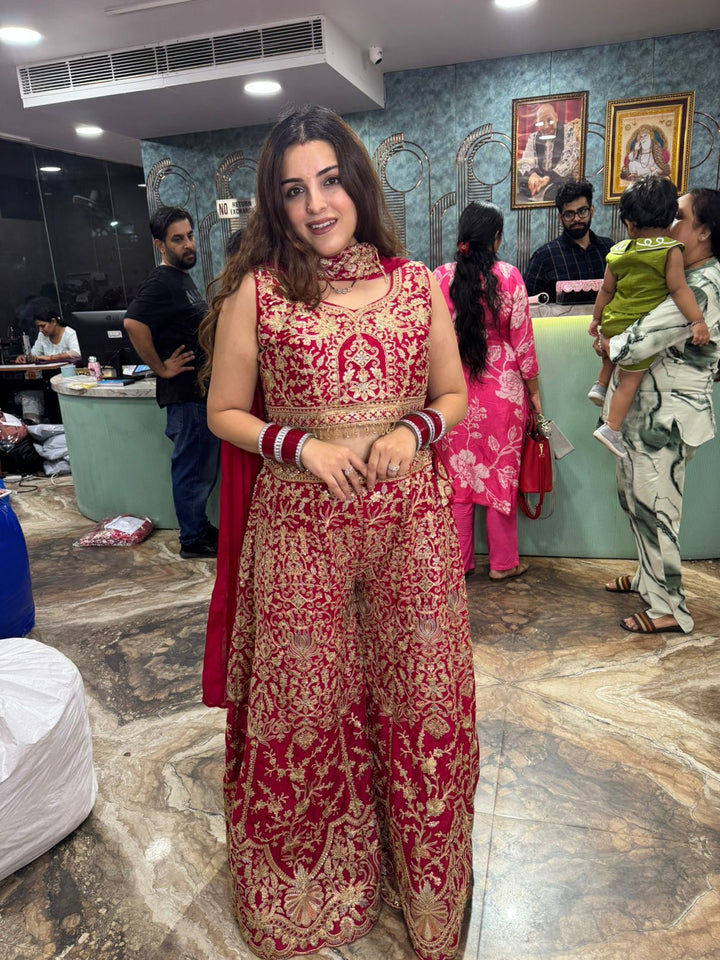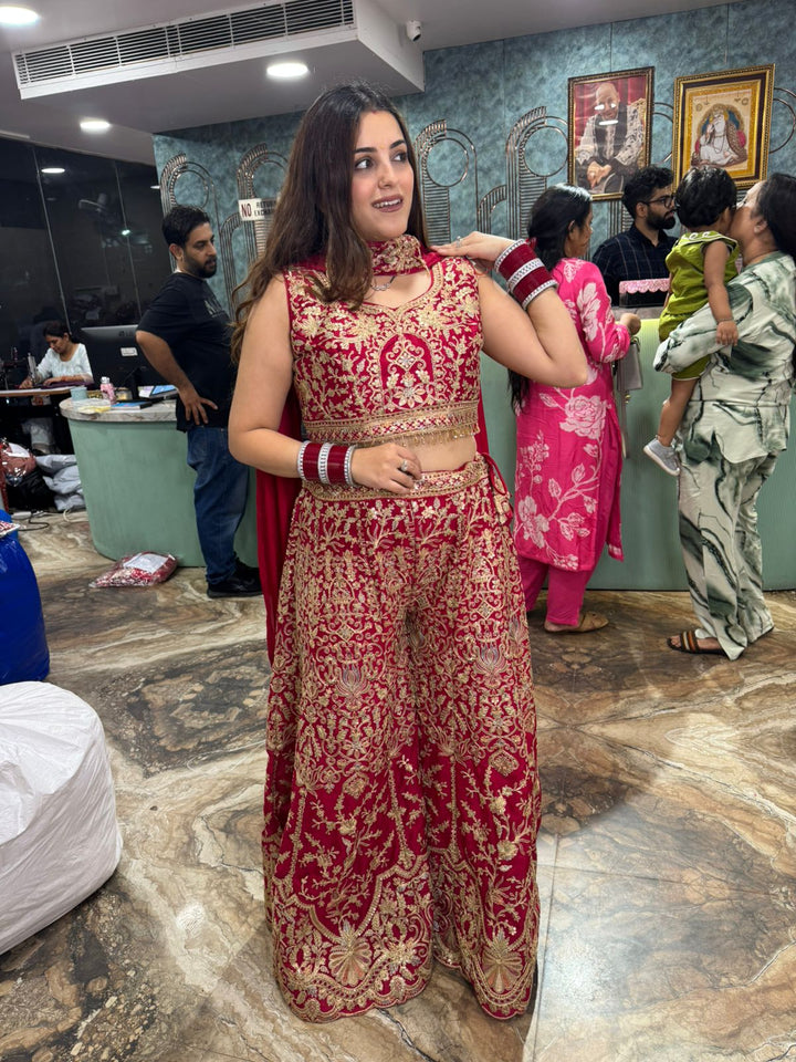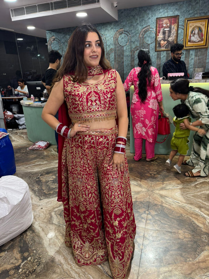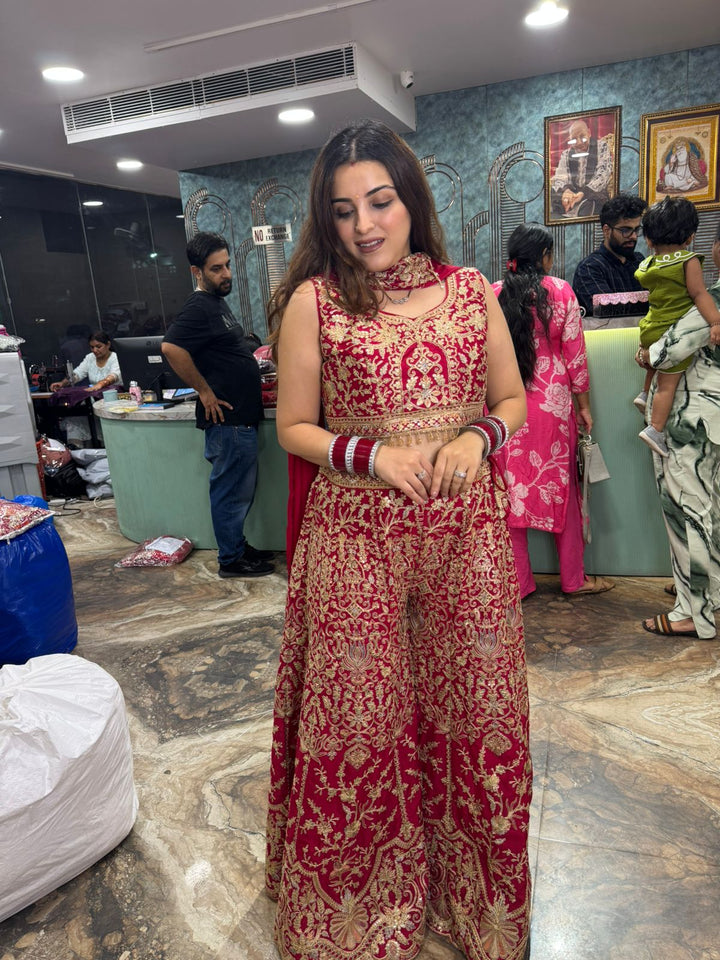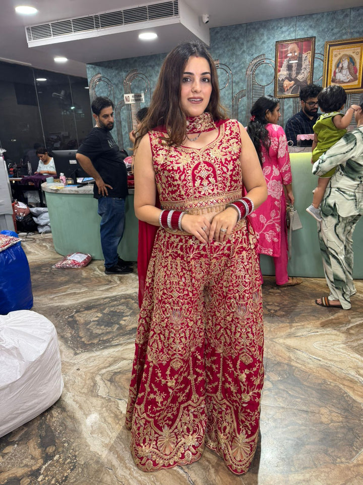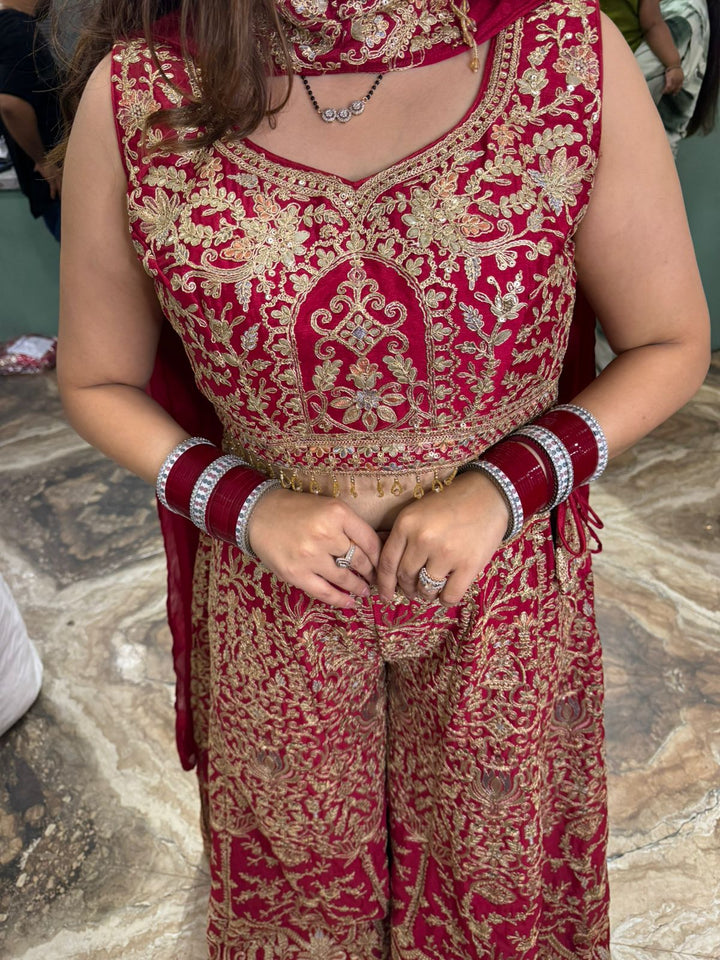 This red sharara set, richly adorned with intricate golden zari and sequin embroidery. The outfit features a sleeveless short kurti blouse, detailed with elaborate floral and paisley motifs and a beaded hemline that adds festive charm. The wide-flared sharara bottoms mirror the same heavy embroidery, creating a statement silhouette with regal appeal. Paired with a matching embroidered chiffon dupatta, this 3-piece set exudes grandeur and tradition, making it a perfect choice for weddings, receptions, or festive celebrations.