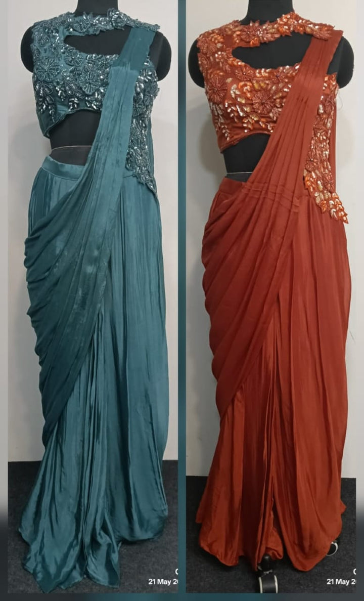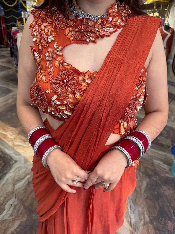 The outfit is a rust or orange-colored ready-to-wear saree, often made from fabrics like crepe or georgette. The saree features a draped style, sometimes with ruffles or layered drapes, and is paired with an embellished blouse. The blouse may have intricate embroidery, sequins, or stone work. The ensemble is typically considered suitable for occasions like parties or weddings.