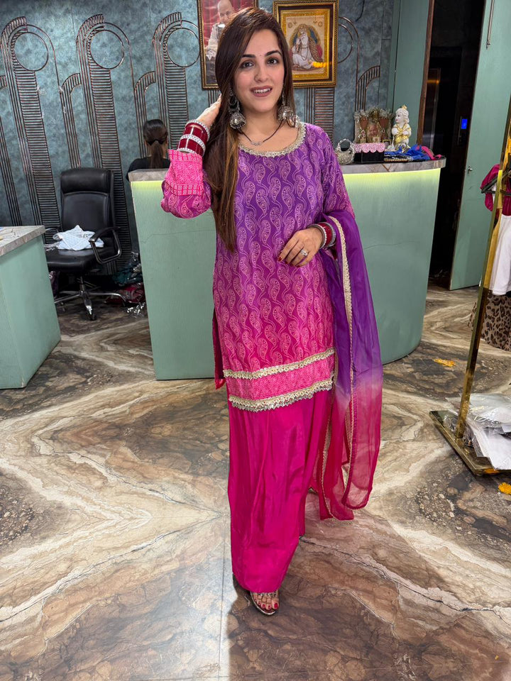 The product is a three-piece Indian ethnic wear suit, the salwar suit outfit features a long tunic (suit) with a paisley-like pattern that transitions from purple at the top to pink at the bottom. The tunic has a decorative border at the hem and back with gold and silver trim. The pants (salwar) are a solid, bright pink color. A sheer dupatta with a similar purple-to-pink gradient and a gold trim border completes the ensemble.