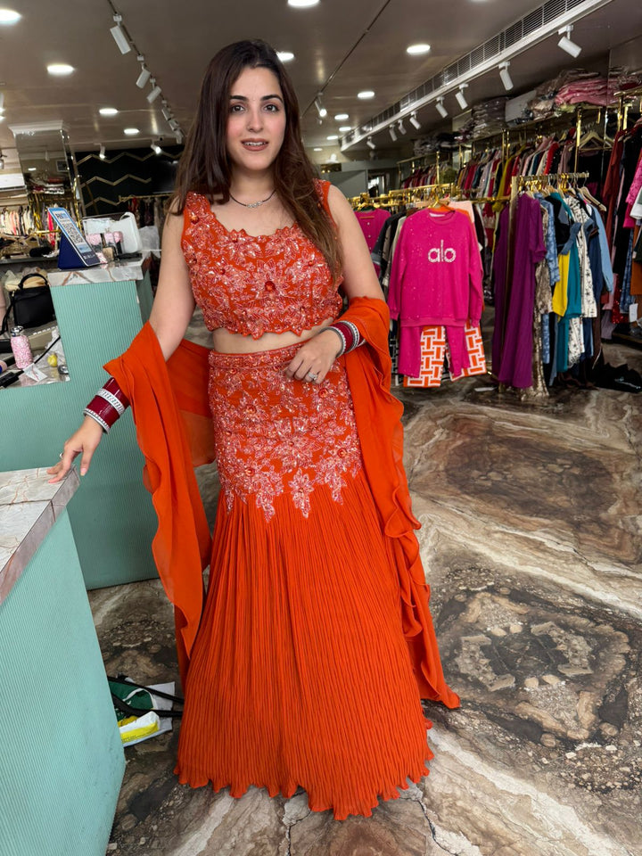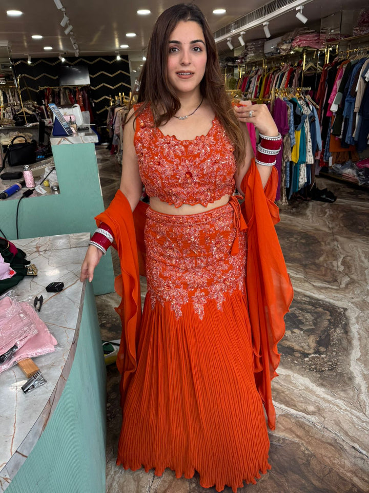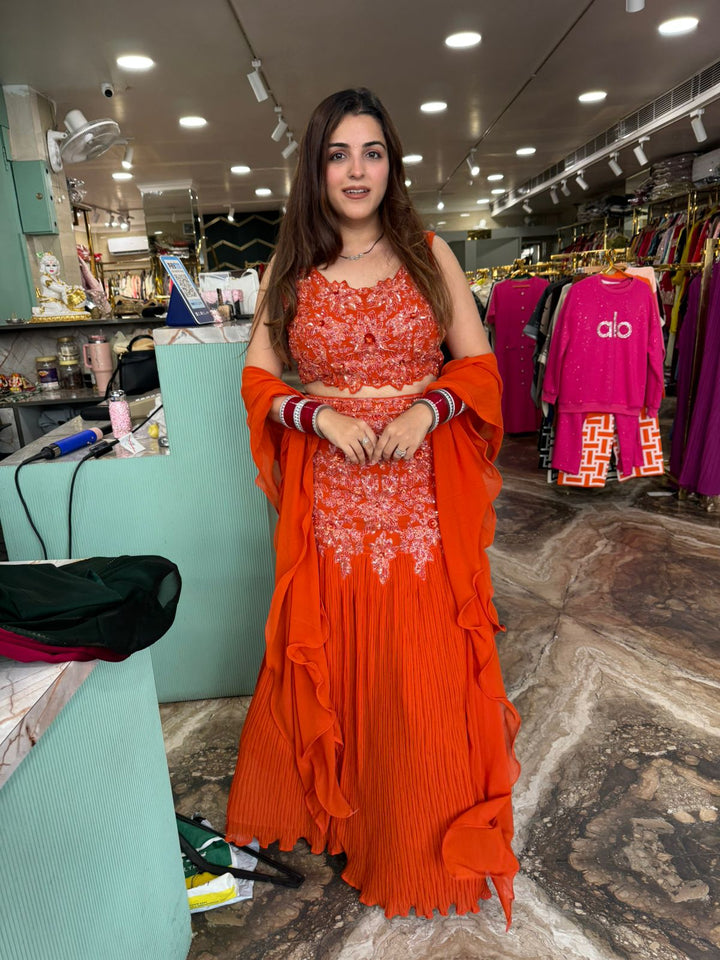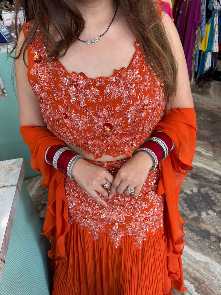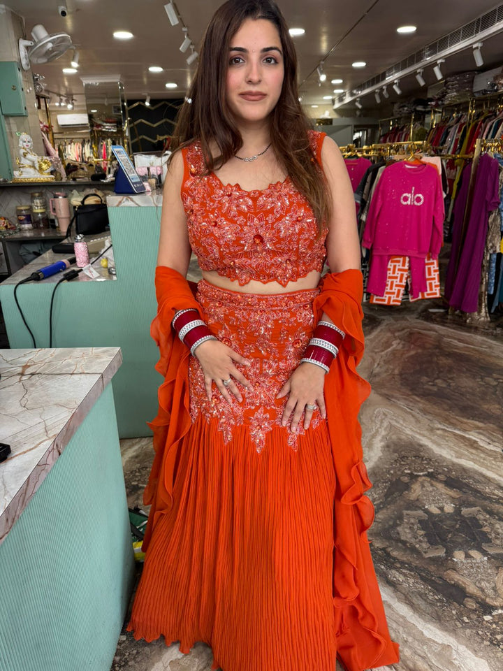 The matching lehenga is beautifully crafted with heavy embroidered detailing around the waistline, transitioning into finely pleated panels for a flowy silhouette. The soft georgette/crepe fabric enhances movement, while the vibrant red dupatta with delicate ruffle edges completes the ensemble.