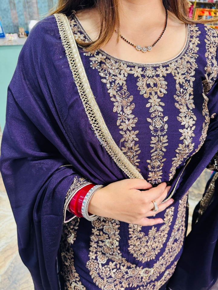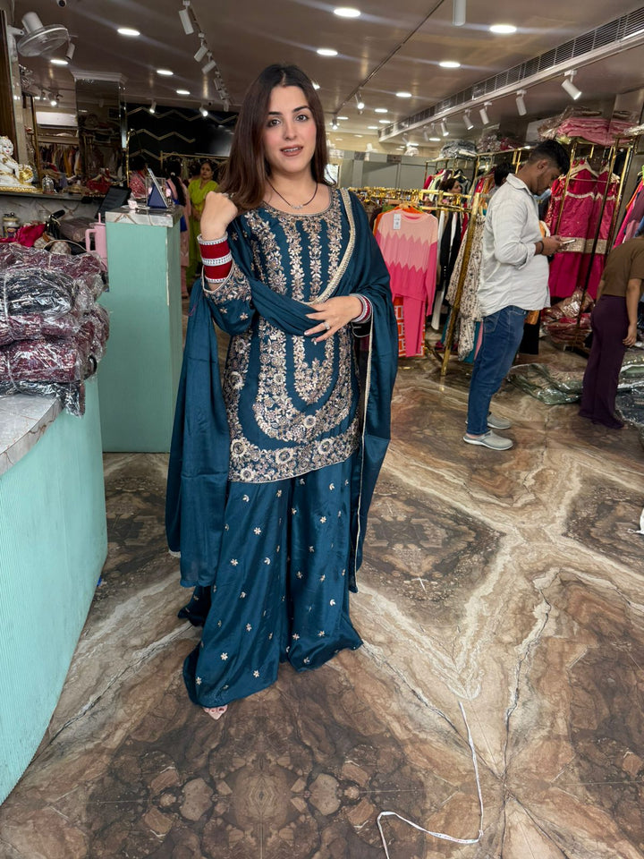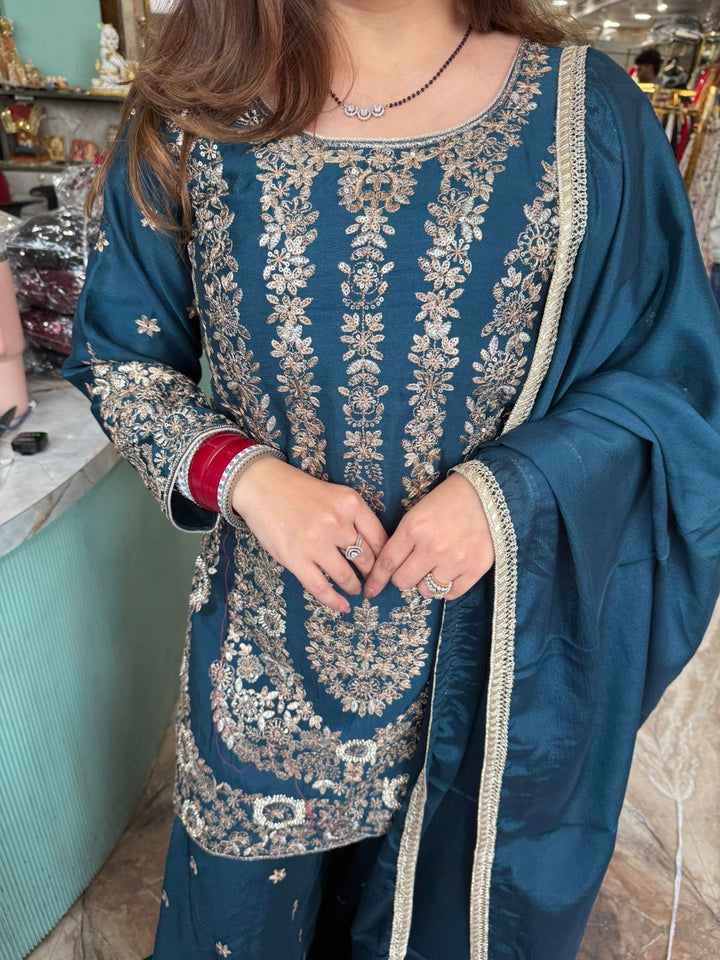 This stunning three-piece traditional ensemble in a rich scarlet red shade. The straight-cut kurta is beautifully adorned with intricate zari and thread embroidery in gold and silver tones, creating a regal and festive appeal. The kurta features a round neckline and full sleeves with detailed embroidered borders, adding an extra touch of elegance.