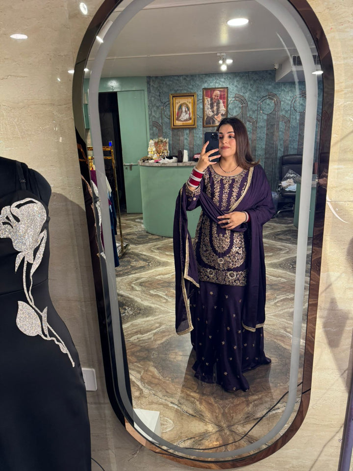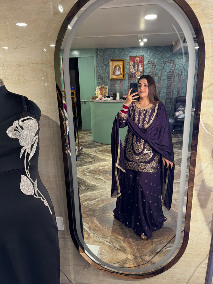 Paired with a flowy sharara bottom highlighted with delicate butis, the set balances grandeur with grace. The look is completed with a matching dupatta, finished with a subtle golden border that enhances the richness of the outfit.