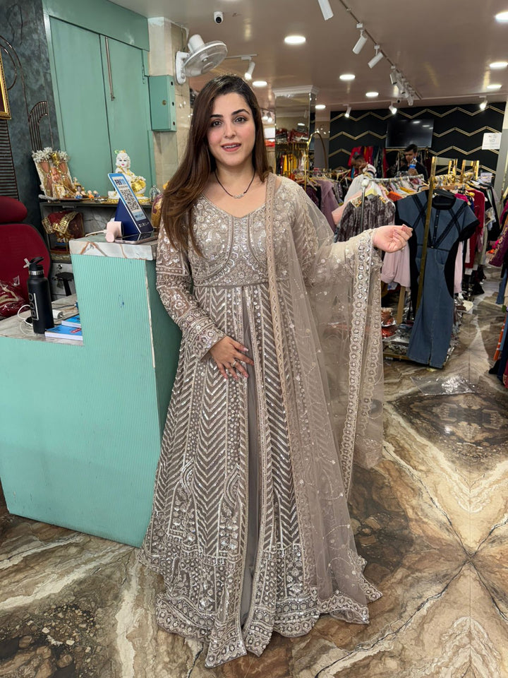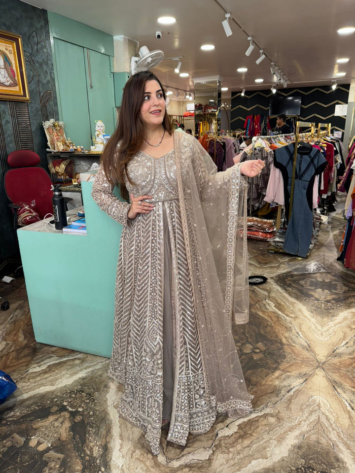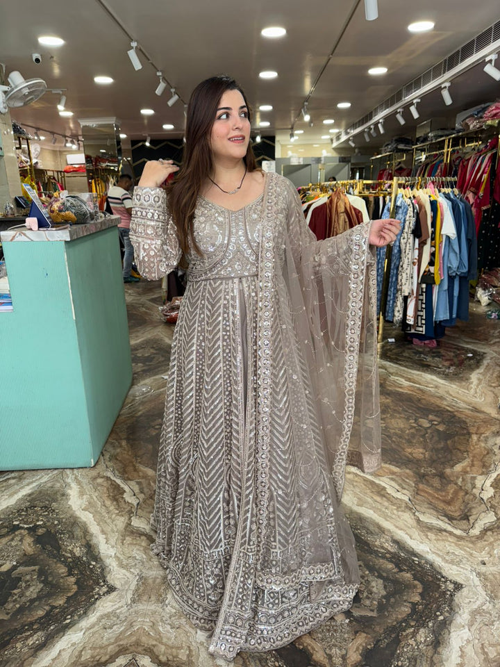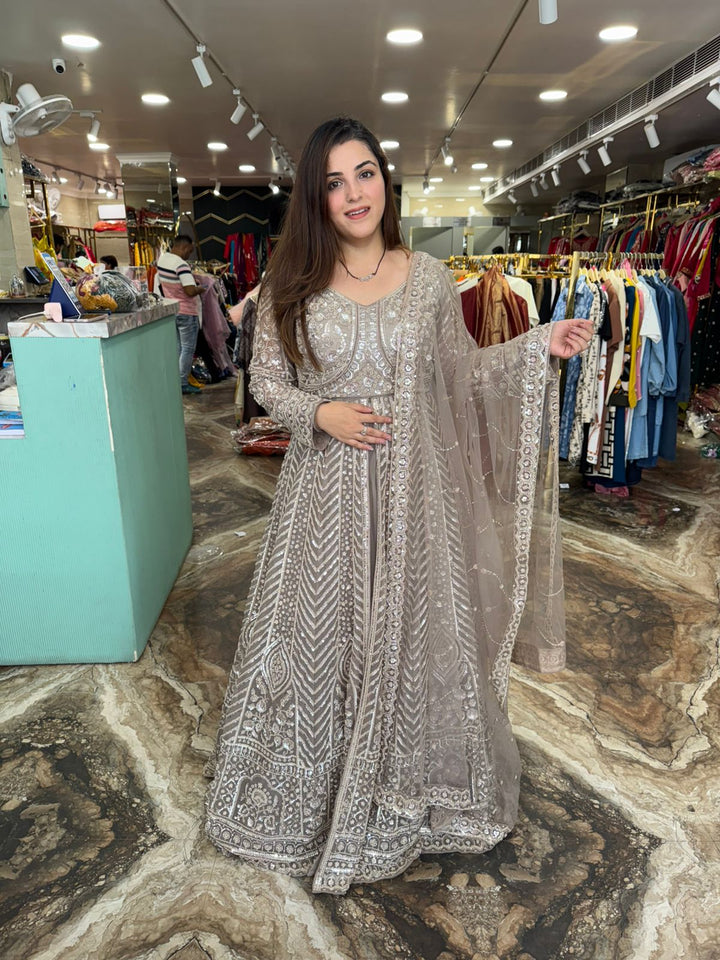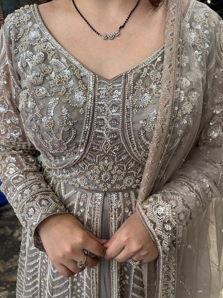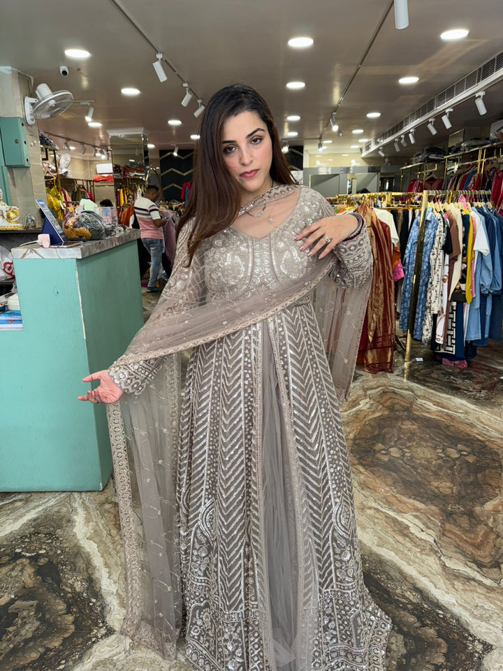 The gown is crafted in a sophisticated taupe-grey shade, offering a subtle yet luxurious vibe. Perfect for weddings, receptions, or festive evenings, this outfit strikes the perfect balance between modern elegance and traditional charm.