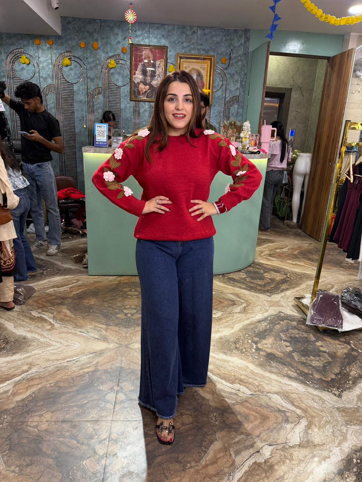 The top is a red sweater with white floral embroidery on the sleeves. Similar items are described as a "Floral Embroidery Crew Neck Sweater" or a "Knitted Sweater with Floral Embroidery". The style can be found on various online retailers, with some described as having a crew neck and long sleeves.